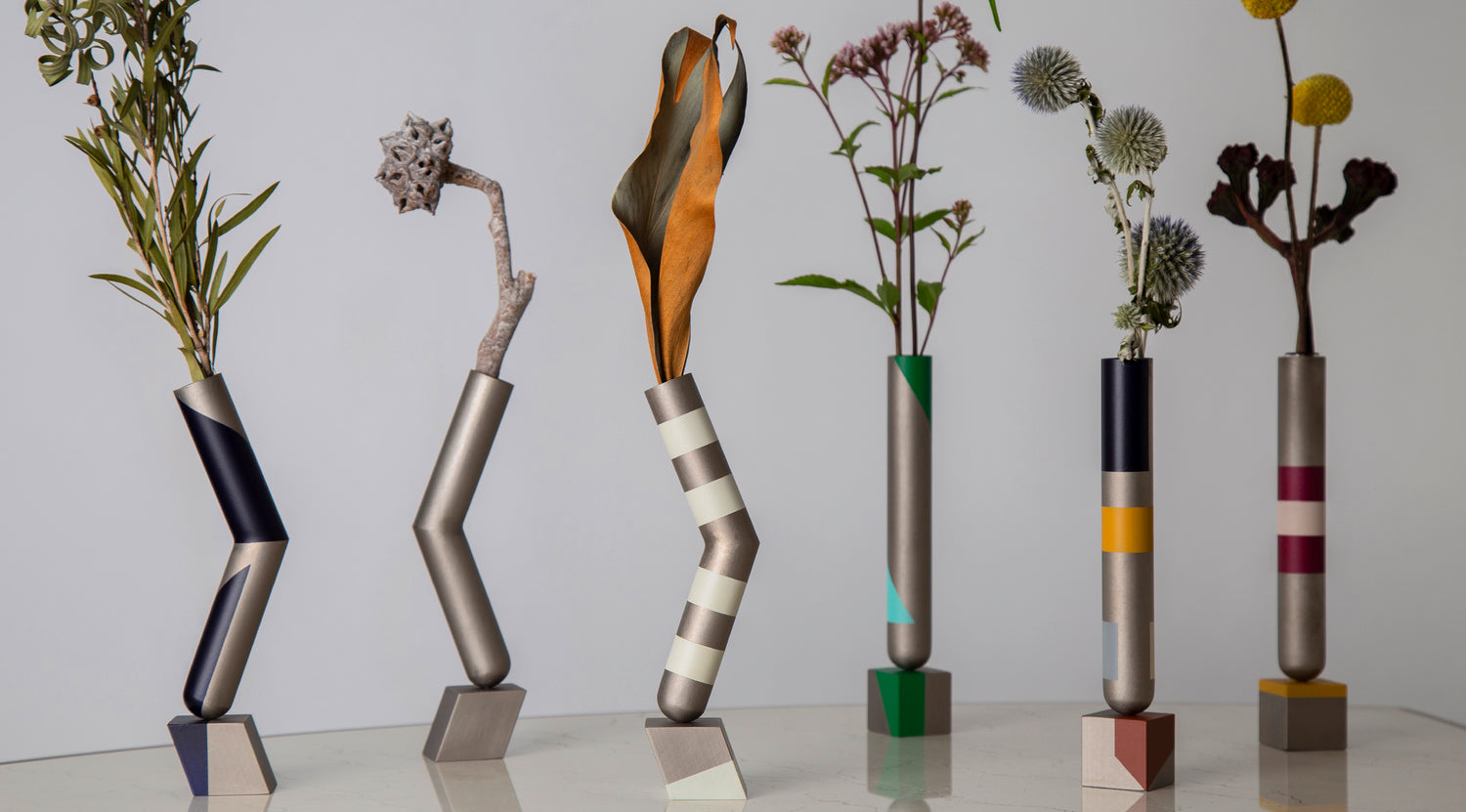 軽やかなフォルムの鉄製一輪挿しです。 “くの字”と”まっすぐ”の2種類を、 メッキ加工の上一つ一つにペイントを施しています。 水差し用にガラス管が付属します。 お花はもちろんのこと、ペン立てなどにも利用できます。